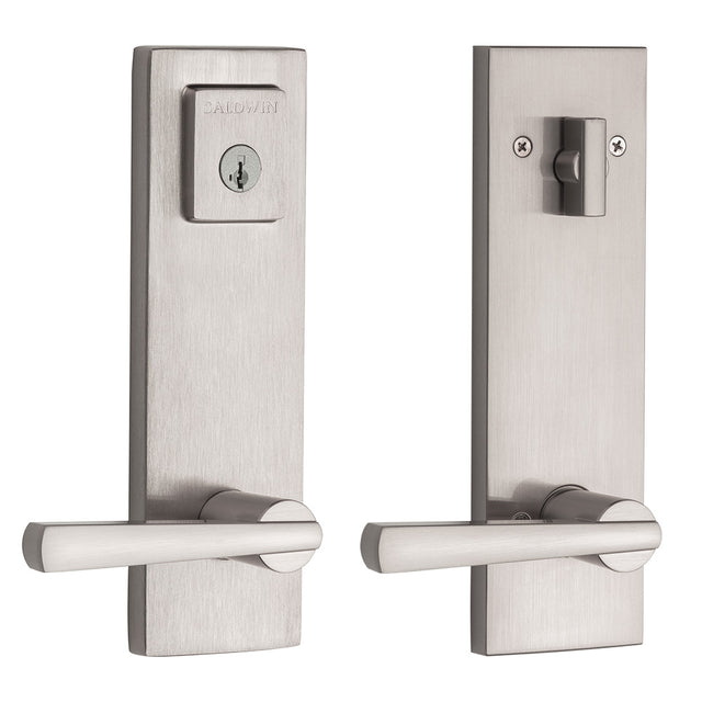 Baldwin Prestige 183SPEXSPLSQR15S Complete Entrance Set with Single Cylinder Deadbolt with Lever by Lever Spyglass Square Design with RCAL Latch; RCS Strike; and SmartKey Satin Nickel Finish is backordered and will ship as soon as it is back in stock.
